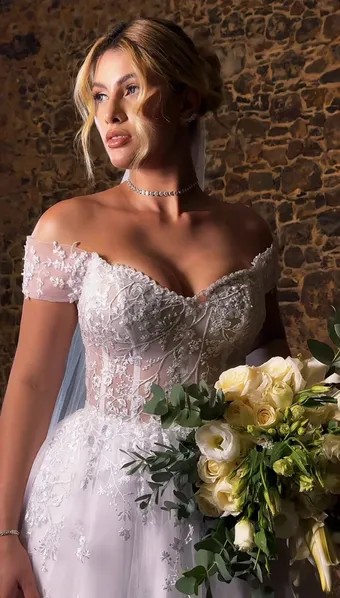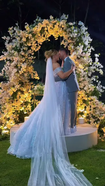 Imagem ilustrativa da notícia Pavani, do Remo, e Tayná Suellem casam em cerimônia íntima camera Tayná Suellem deslumbra em vestido de princesa enquanto Giovanni Pavani acrescenta um toque contemporâneo com seu terno em tons pastéis e tênis branco, em um dia que ficará marcado para sempre no coração do casal. | Divulgação