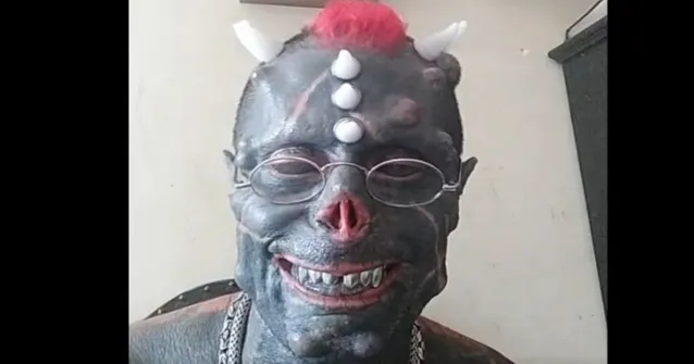 O tatuador busca assumir um visual de um demônio, embora seja cristão, e já adicionou chifres, presas e, recentemente, amputou um dos dedos, para dar a aparência que possui quatro garras em suas mãos.